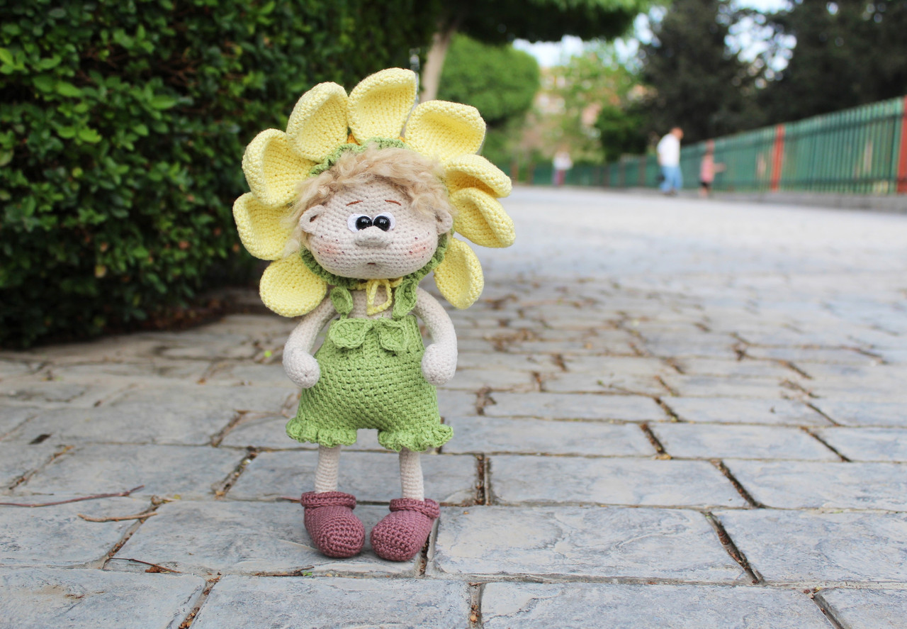 Состоит из письменной инструкции + фото вязания куклы и комплекта одежды (шапочка цветок, комбинезон и ботинки) - 25 страницы и 50 фотографий.