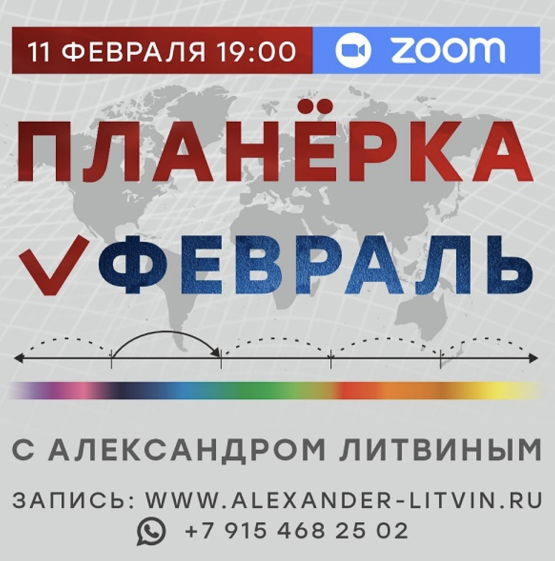 В среду, 11 февраля 2026 года, в 19.00 по Москве в Zoom состоится наша традиционная ежемесячная встреча - онлайн сессия вопросов и ответов "ФЕВРАЛЬ 2026. ПЛАНЕРКА С АЛЕКСАНДРОМ ЛИТВИНЫМ". Александр Богданович даст анализ предстоящему периоду и ответит на вопросы зрителей.